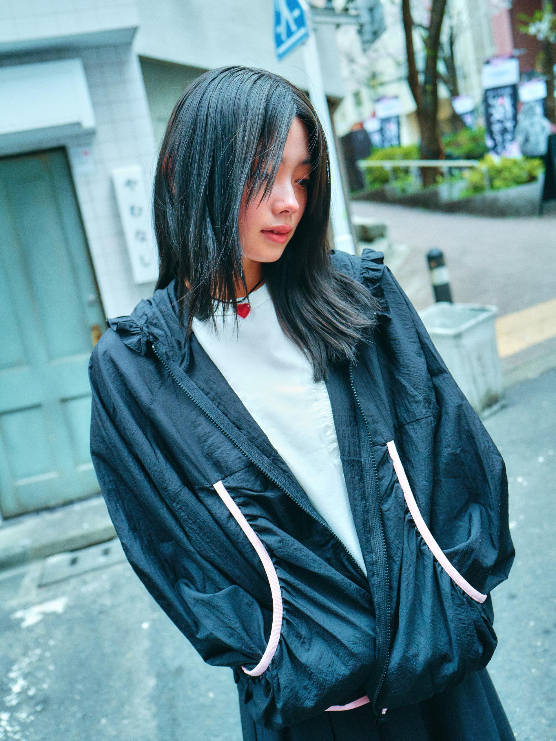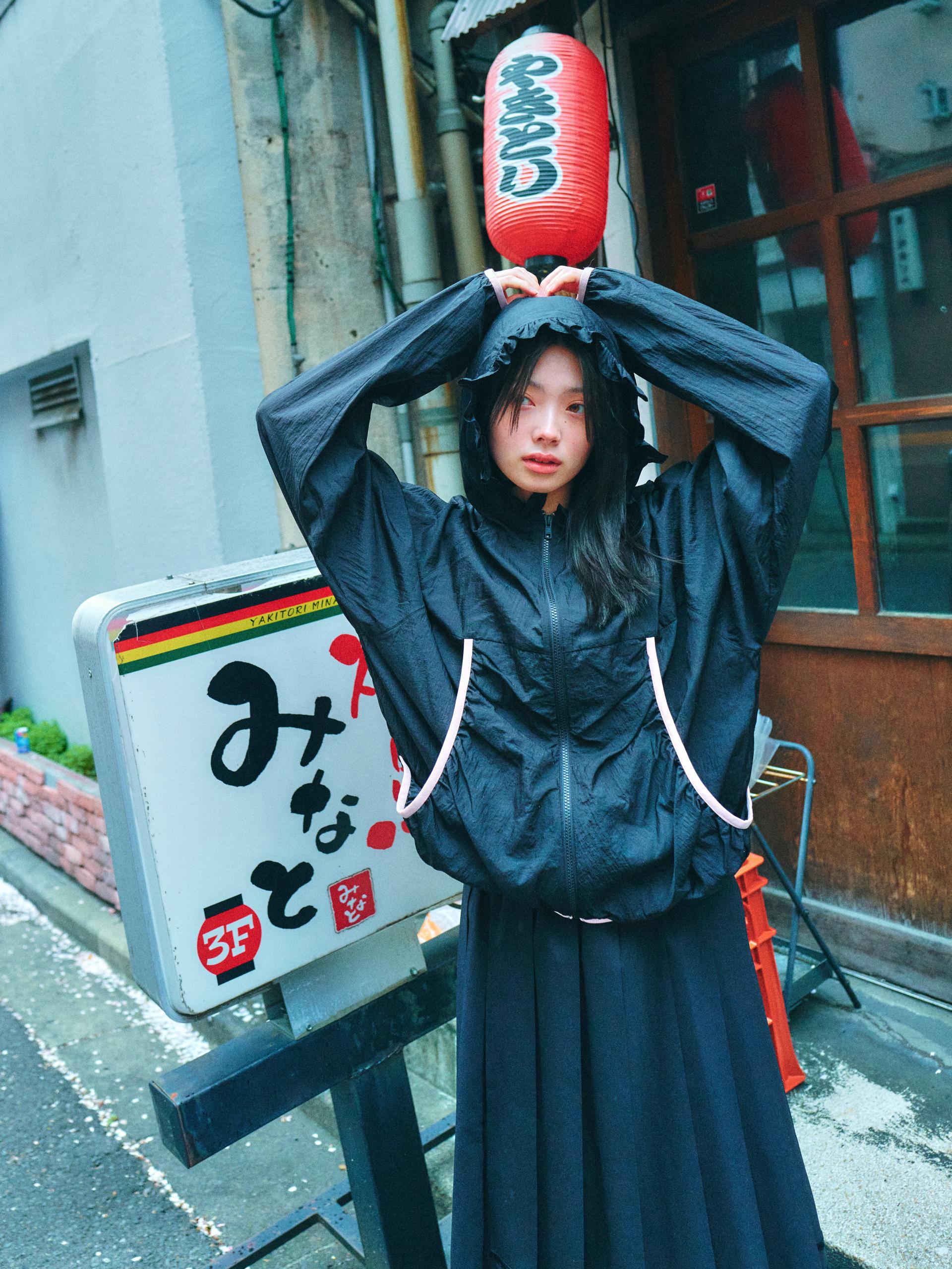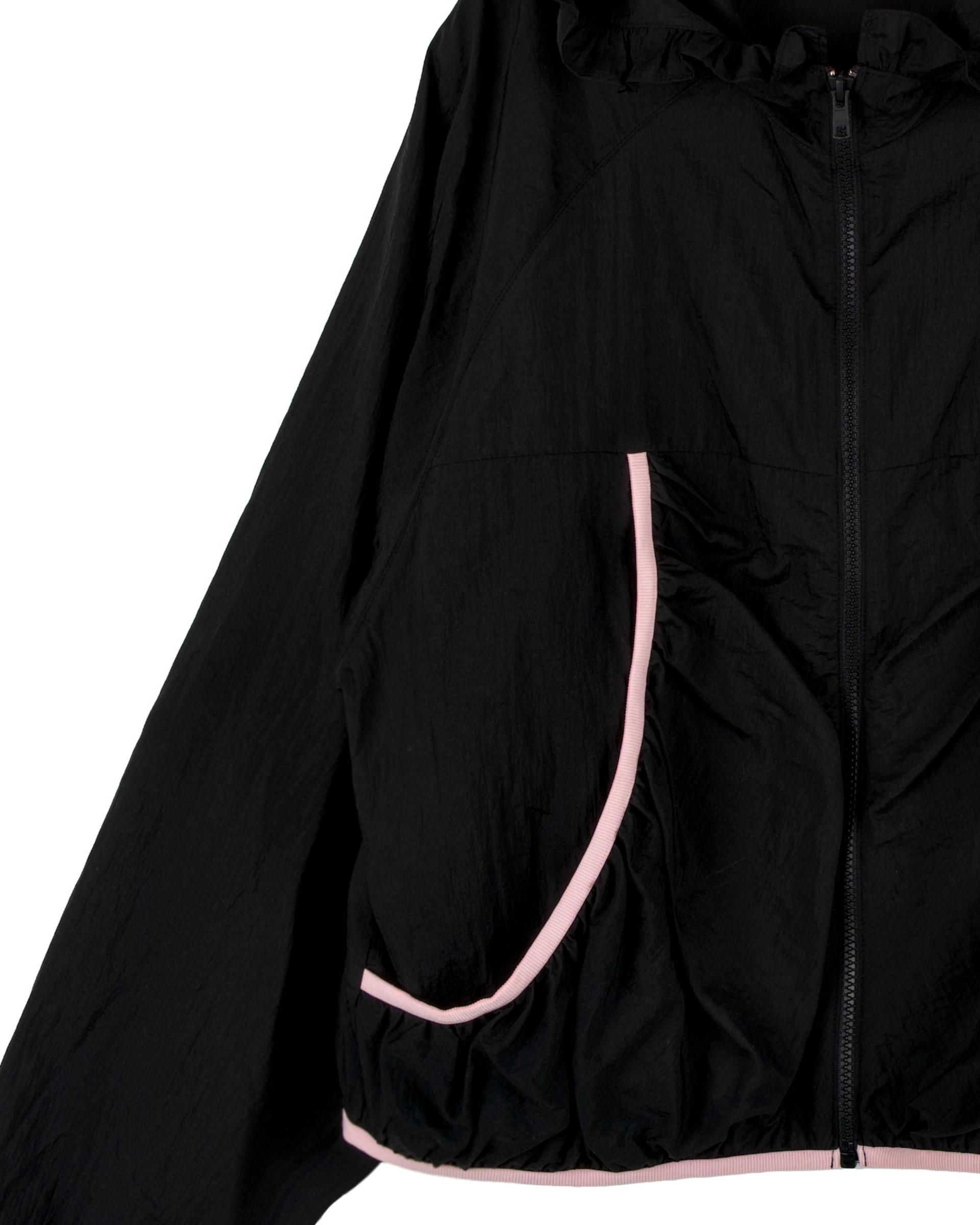 OVERSIZED FRILL HOODED WINDBREAKER_BLACK