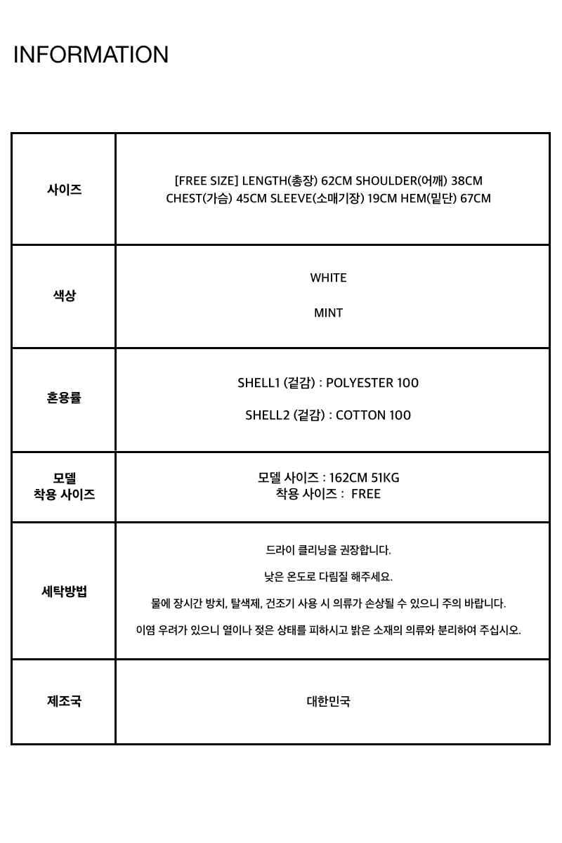 [FREE SIZE] LENGTH(총장) 62CM SHOULDER(어깨) 38CM
