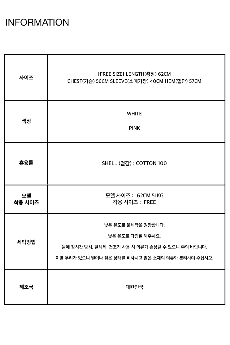 CHEST(가슴) 56CM SLEEVE(소매기장) 40CM HEM(밑단) 57CM