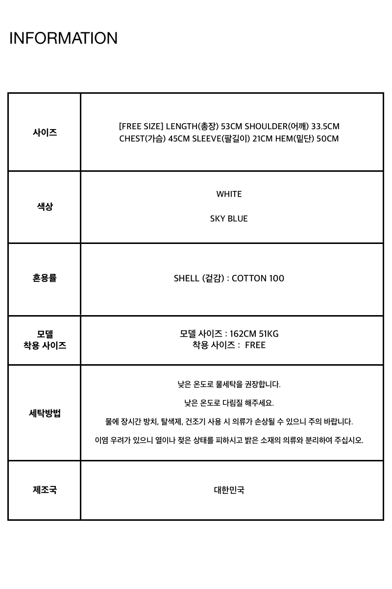 [FREE SIZE] LENGTH(총장) 53CM SHOULDER(어깨) 33.5CM CHEST(가슴) 45CM SLEEVE(팔길이) 21CM HEM(밑단) 50CM